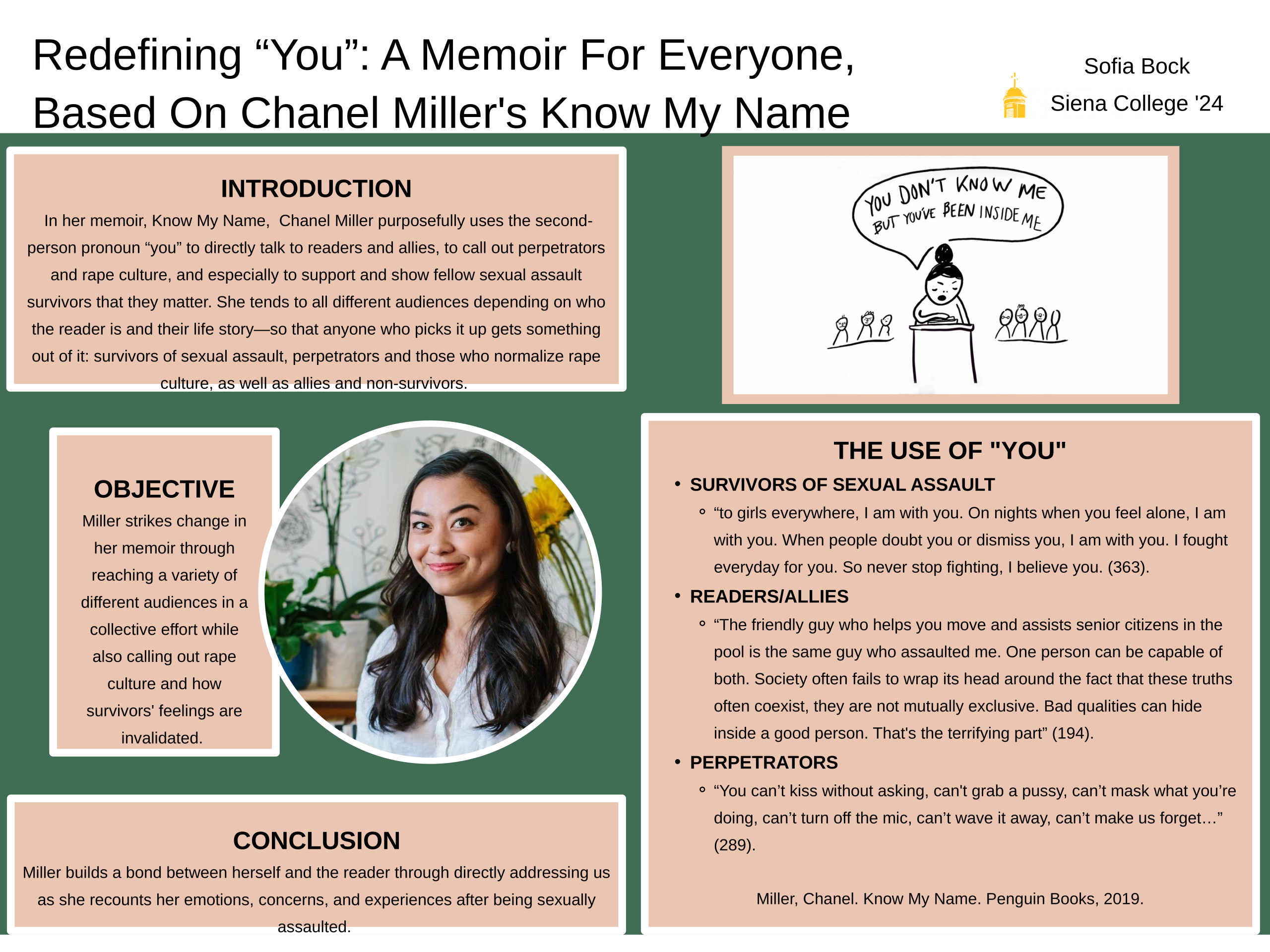 All people have a right to their own experiences and narratives in all capacities. In her memoir, Know My Name, I argue that Chanel Miller purposefully uses the second-person pronoun “you” to directly talk to readers and allies, to call out perpetrators and rape culture, and especially to support and show fellow sexual assault survivors that they matter. This is important because she tends to all different audiences depending on who the reader is and their life story—so that anyone who picks it up gets something out of it: survivors of sexual assault, perpetrators and those who normalize rape culture, as well as allies and non-survivors. Most importantly, Miller takes an optimistic approach to sharing her narrative and story in a way that everyone is called out and brought into the picture: she purposely does not leave any one else out because she does not want anyone to feel how she felt when she did not talk for a year. In doing all of this and shifting the “you”, Miller makes her story relevant to every single person no matter who they are, calling for change from each and every reader as she copes through each piece of advice and statement she gives.